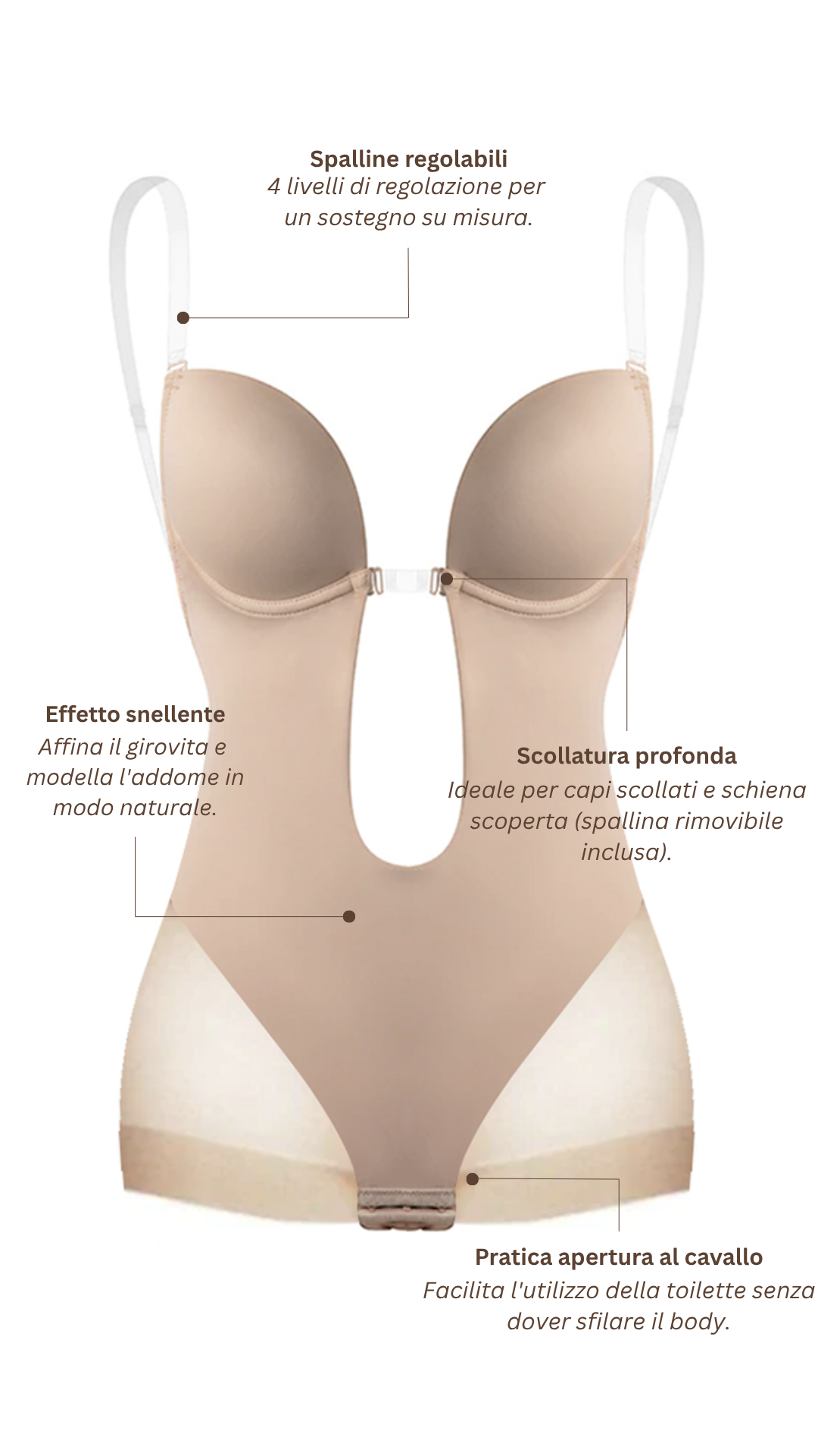 Una soluzione elegante e invisibile che permette di indossare abiti con la schiena scoperta garantendo sostegno, comfort e discrezione.